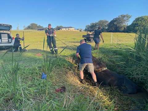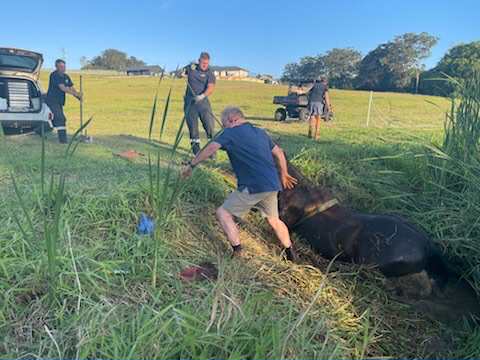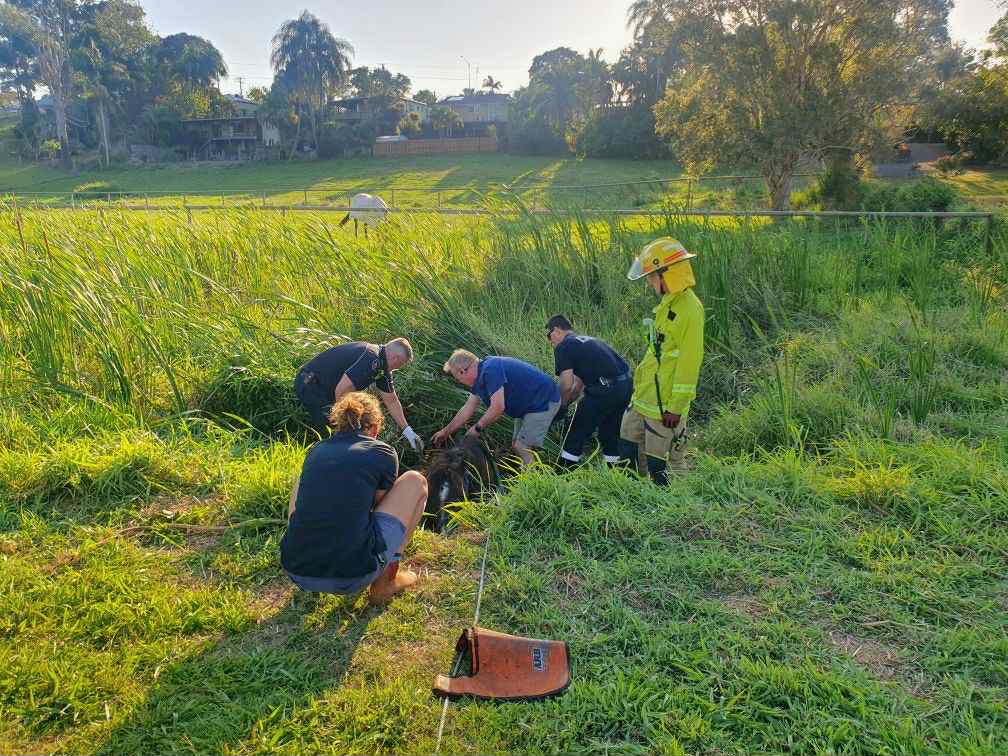 Working alongside the Nambour Fire Brigade, straps were carefully placed around Sunday’s chest to begin the extraction. The team slowly winched him forward by approximately half a metre, gaining access to his tail and allowing further manual assistance.